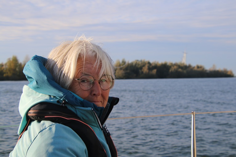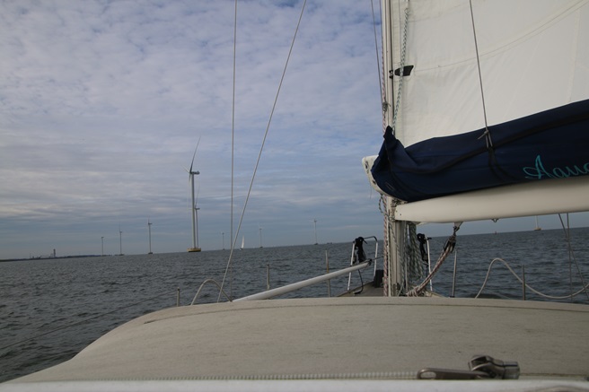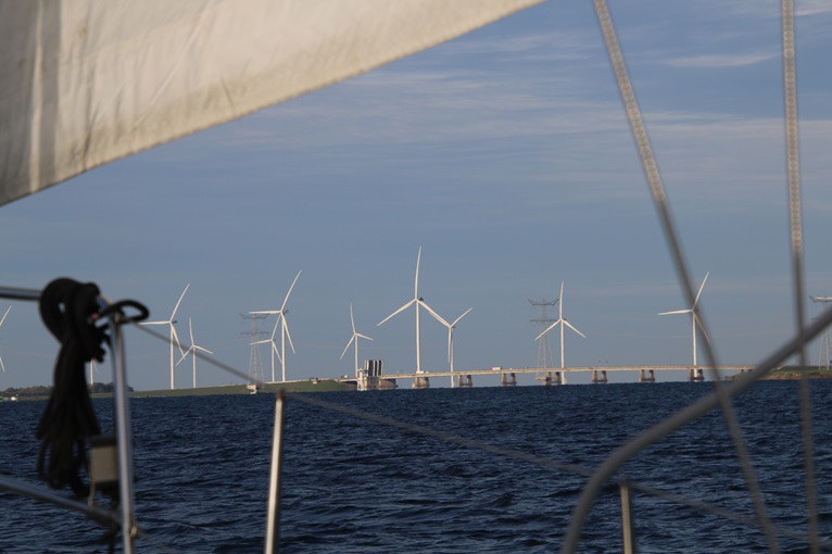 Op het IJsselmeer gaan we bakboord uit naar Lelystad. Even de vraag of we door het daar gelegen windpark zullen gaan. Het mag, en het is goed bezeild, en zo varen wij op windkracht voor het eerst met links en rechts windmolens.