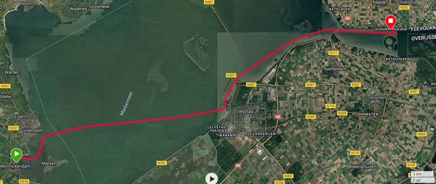We draaien na de sluis langs de Poepende Man het Markermeer op. En weer met ruime wind stuiven we naar de Gouwzee. We eten boterhammen die we al in Workum hadden gekocht; laten we zeggen dat zijn Oranjekoek beter smaakte. Na een kleine drie uur passeren we het uiterste puntje van Marken en varen we de Gouwzee op.