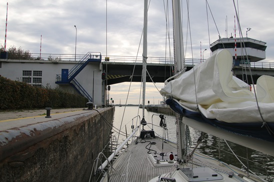 We gaan steeds zo’n 5 knopen dus schieten we, ondanks dat we het eerste rif hebben gestoken, lekker op. Het is ook behoorlijk druk hier met behoorlijk veel beroepsvaart uit Friesland. Maar aangekomen bij de Houtribsluis zijn we samen met een klipper die een eindje voor ons vaart. We mogen, als we doorvaren, van de sluiswachter mee de sluis in. Maar waar de klipper gelijk de brug onderdoor mag moeten wij aan de andere kant blijven liggen. De brug gaat pas open als er weer zeilboot van de andere kant komt.