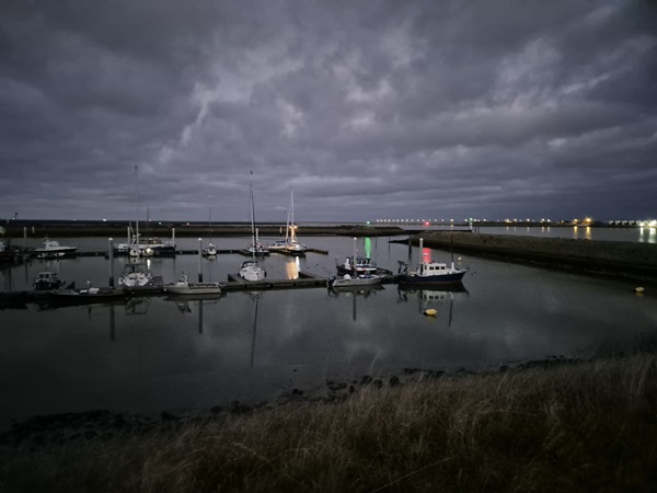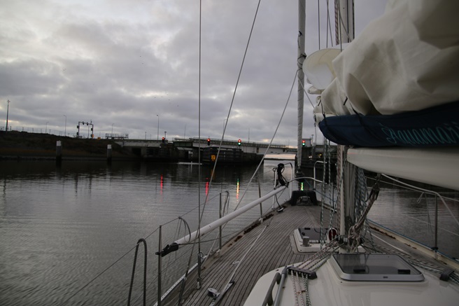 Maar als we de sluis naderen en met de marifoon de sluiswachter oproepen gaat er gelijk een groen licht branden ten teken dat hij al met de voorbereiding van onze sluispassage is begonnen. En zo passeren wij vlot de sluis waarna ook bij de brug een groen licht brandt. Al snel draait de brug en worden we zelfs aangemoedigd om even door te varen (om het autoverkeer zo min mogelijk te hinderen). En zo zijn we net na 19uur op zout water.