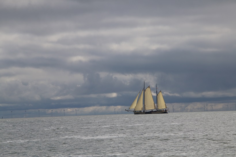 We vertrekken even na half elf – mooi op tijd – en hijsen de zeilen als we het Krabbersgat uit zijn. Het is best druk met klippers die nog met groepen een weekje weggaan – het is herfstvakantie in het zuiden en vast ook wel ergens in Duitsland. Met de mooie luchten, het is in de ochtend vooral grijs, geeft dat af en toe een mooi plaatje.