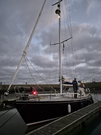 De haven is dichtbij. We leggen met een spring aan aan een vingerpier aan bakboord. En controleren even of al onze navigatielampen wel goed branden.