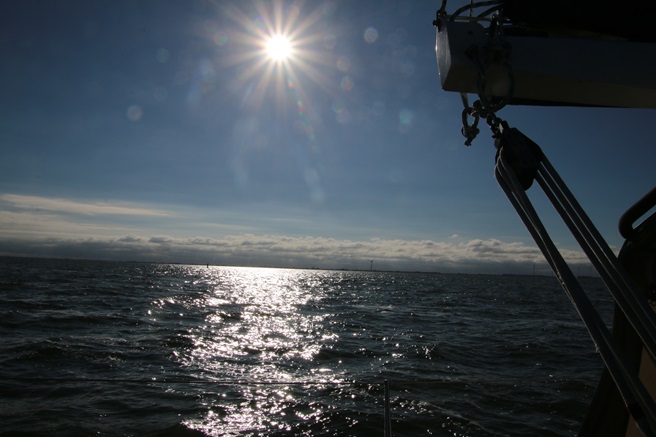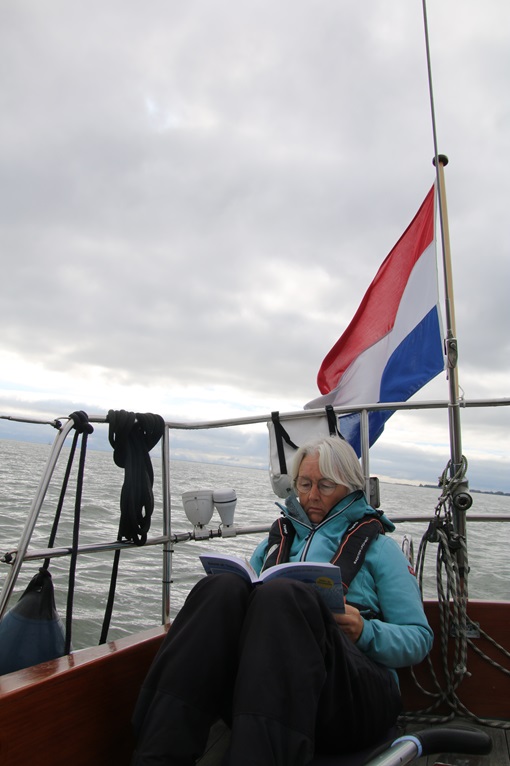 Gelukkig trekt in de middag de wind iets aan (naar een kracht drie) en kan de stuurautomaat het werk goed doen en halen we ook snelheden tussen de 4 en 5 knopen. Voor Ellen tijd om in het boek Overstag te lezen; het moet toch uit voordat iemand het wil lenen.