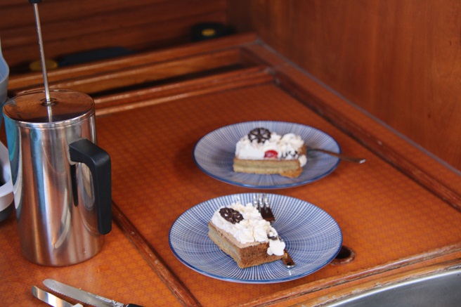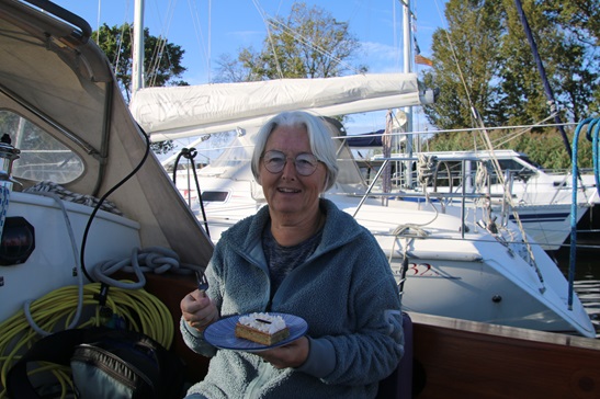 Nijlpaarden in de IJssel? We liggen in Schokkerhaven en dat betekent dat Schokland niet ver hier hier vandaan is. Dit voormalige eiland hebben we nog nooit eerder bezocht. Het is een zonnige dag dus drinken we na ontbijt en douche nog koffie in de kuip met daarbij Oranjekoek uit Friesland.