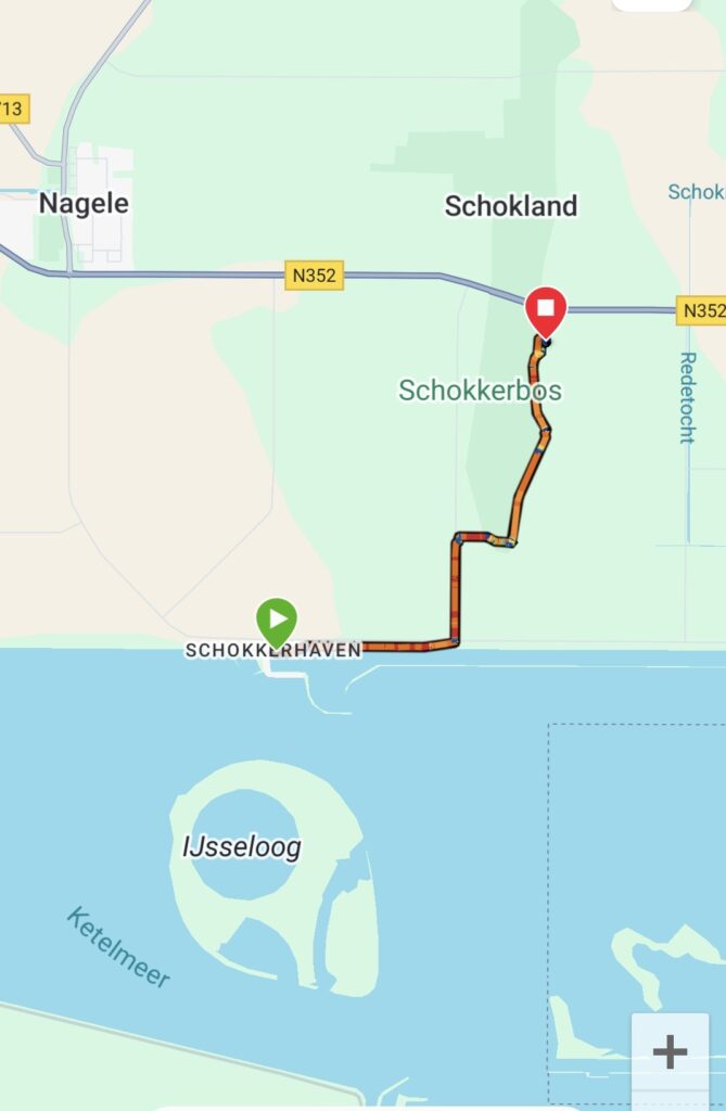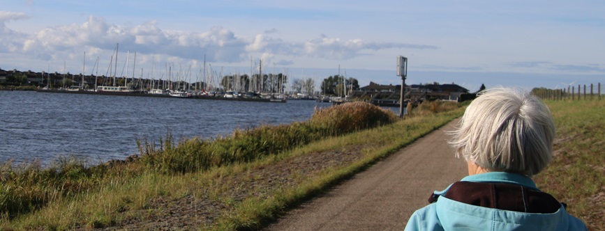De route loopt eerst een stuk langs het Ketelmeer en omkijkend zien we onze haven mooi liggen.