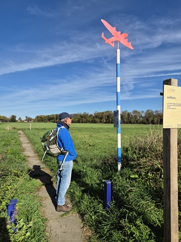 Dan steken we het land in en zien we Schokland mooi liggen. De rechte polderlijnen worden onderbroken door kromme lijnen en hoogteverschillen van het voormalige eiland. Ook hier is in de 2e wereldoorlog een bommenwerper neergekomen.