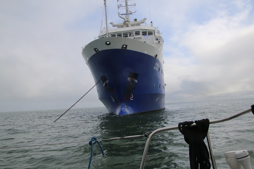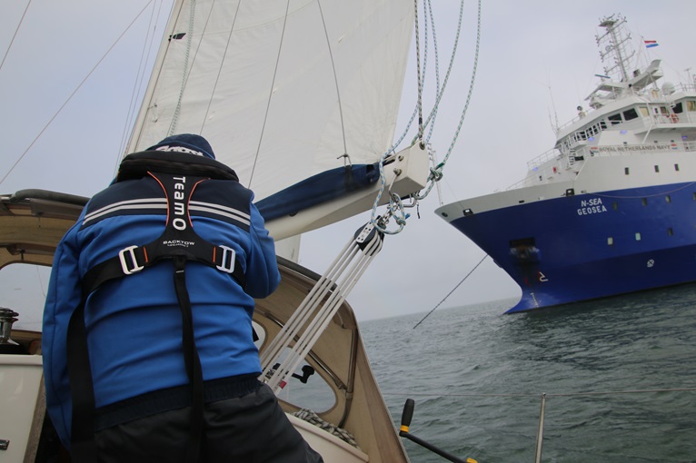Of Joost de fotograaf aan boord wil plezieren? Daarvoor haalt hij wel een waagstukje uit. Hij gaat vlak voor een ‘voor anker liggend’ onderzoeksschip langs terwijl hij scherp aan de wind vaart en de boot benedenwinds ligt.