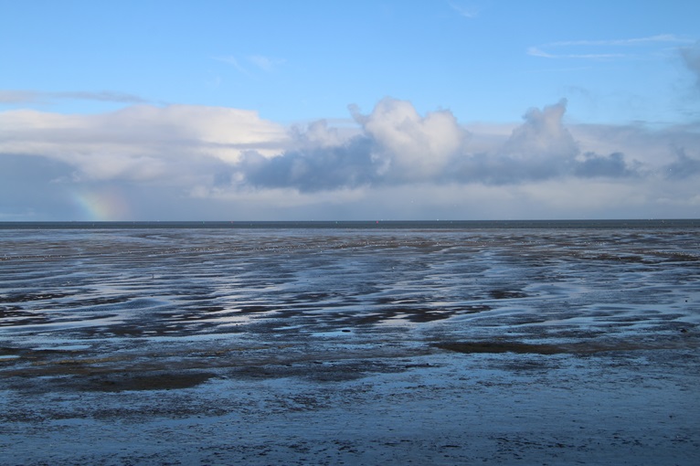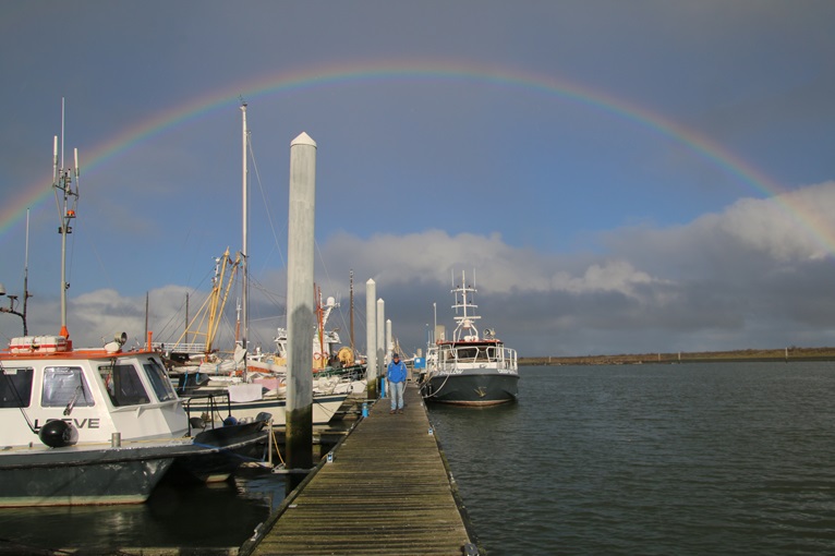 Bij wakker worden is het grijs en mistig, maar als we hebben ontbeten en naar buiten gaan zijn er opklaringen naast buien en dan kan je over de steiger onder de regenboog lopen.