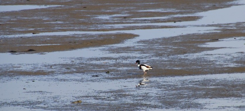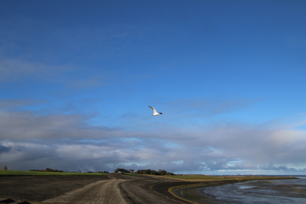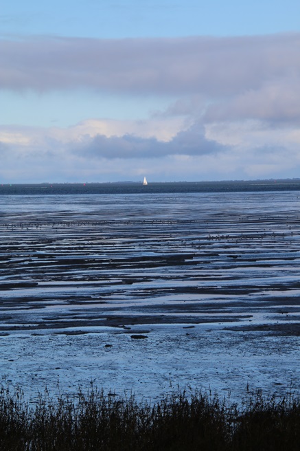Het is laag water dus op het wad zijn veel vogels. In de verte gaat een zeilboot, daar willen wij straks ook varen.