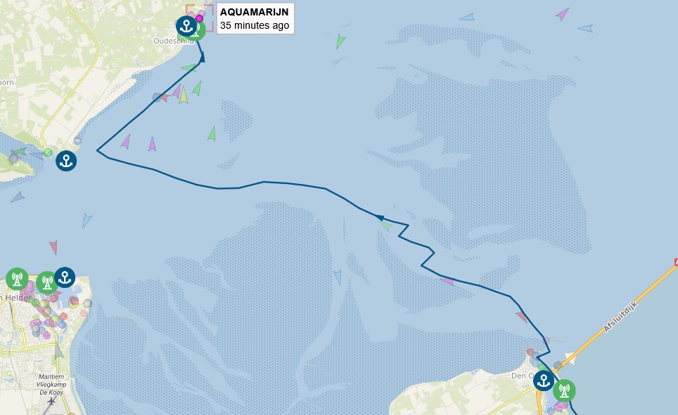 Na een uur zijn we allebei weer op de boot terug. We bespreken nog even het plan om naar Texel te varen. Het moet lukken met de noorderwind. Eerst via het Visjagersgaatje noordwestelijk en dan via de Texelstroom noordoostelijk. Om 12 uur vertrekken we. Het is weer heerlijk zeilweer, we hebben niet te klagen. Goede wind en scherp aan de wind varen gaat ook goed. We moeten wel 2 keer overstag maar we hebben genoeg ruimte nog buiten de vaargeul waar het diep genoeg is om te varen. Een grote aluminium Bestevaer haalt ons in, gaat bijna 2 keer zo snel. Maar hij houdt wel de vaargeul aan en vaart een stuk om. Je denkt, zo’n grote boot kiest wel het ruime sop, maar hij slaat ook rechtsaf de Texelstroom in om naar Texel te varen. We krijgen af en toe een bui over ons heen. Voor Texel zien we weer een mooie regenboog.