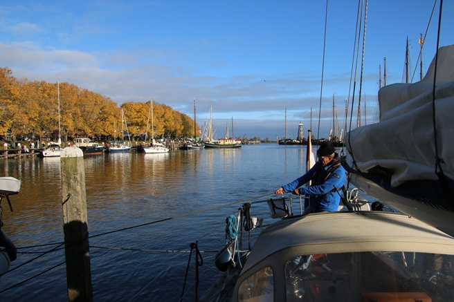 Via de marifoon werd gewaarschuwd dat er vanwege een klipperrace bij Enkhuizen mogelijk minder ligplaatsen voor passanten zijn. Het is zondagmiddag en we vermoeden dat er alleen maar meer ruimte komt. Er liggen nog best veel klippers maar er zijn heel wat boxen vrij waar wij we een van nemen. De zon laat de mooie herfstkleuren extra uitkomen.