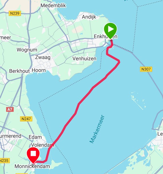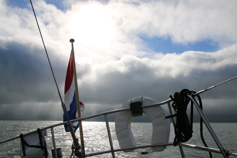 Na een windstille nacht is het nog steeds windstil. Na het ontbijt ga ik toch nog vergeten boodschappen doen terwijl Joost de boot vaarklaar maakt. Om half twaalf varen we en gaat het ook opeens waaien. De hele week wordt een noordenwind voorspelt, maar nu is het nog even noordwest en zodoende kunnen we mooi de 30 graden halen die we moeten aanhouden om in Enkhuizen te komen. De wind trekt later ook nog aan zodat we heerlijk gaan. Er zijn wel veel en dikke wolken, maar hoe dichter we bij Enkhuizen komen hoe vaker er een zon doorbraakmomentje is.
